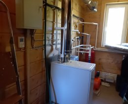 Дом с трех сторон окружен широкой террасой, общими являются коммуникации: котел на дизельном топливе можно переключать на электричество, отопление - батареи, вода из колодца на участке, проложены трубы, используется круглогодично, все утеплено, есть система фильтров очистки воды.
