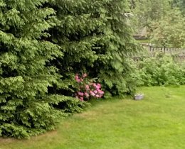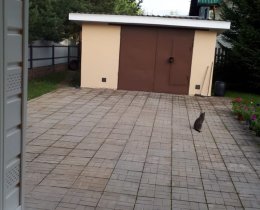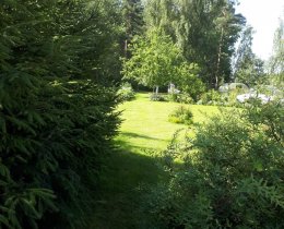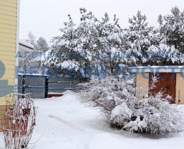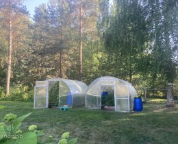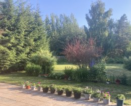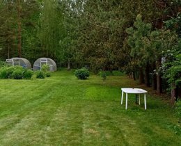 На участке есть дополнительные постройки: гараж, хозяйственные постройки, теплицы. Участок ухоженный с плодовыми деревьями и кустами, грядками, клумбами и газоном, есть фонтанчик, сразу за участком - пруд и лес. Участок огорожен металлическим забором с воротами, площадка перед домом выложена тротуарной плиткой.