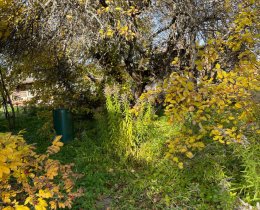 Участок с плодовыми деревьями из разных сортов яблонь, ягодных кустов, цветов и многолетних растений.