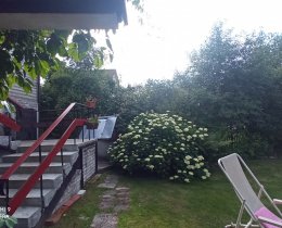 На втором (поднимаемся по лестнице из гостиной) - две больших спальни с лоджиями. Это даёт возможность даже в любую жару хорошо проветривать дом и в нем нежарко. Со второго этажа - выход на вынесенную террасу на опорах. Это особая прелесть дома: терраса увита диким виноградом; она большая, около 9 метров, с креслами и столиком. С террасы можно спуститься сразу во двор. Лестница бетонная.