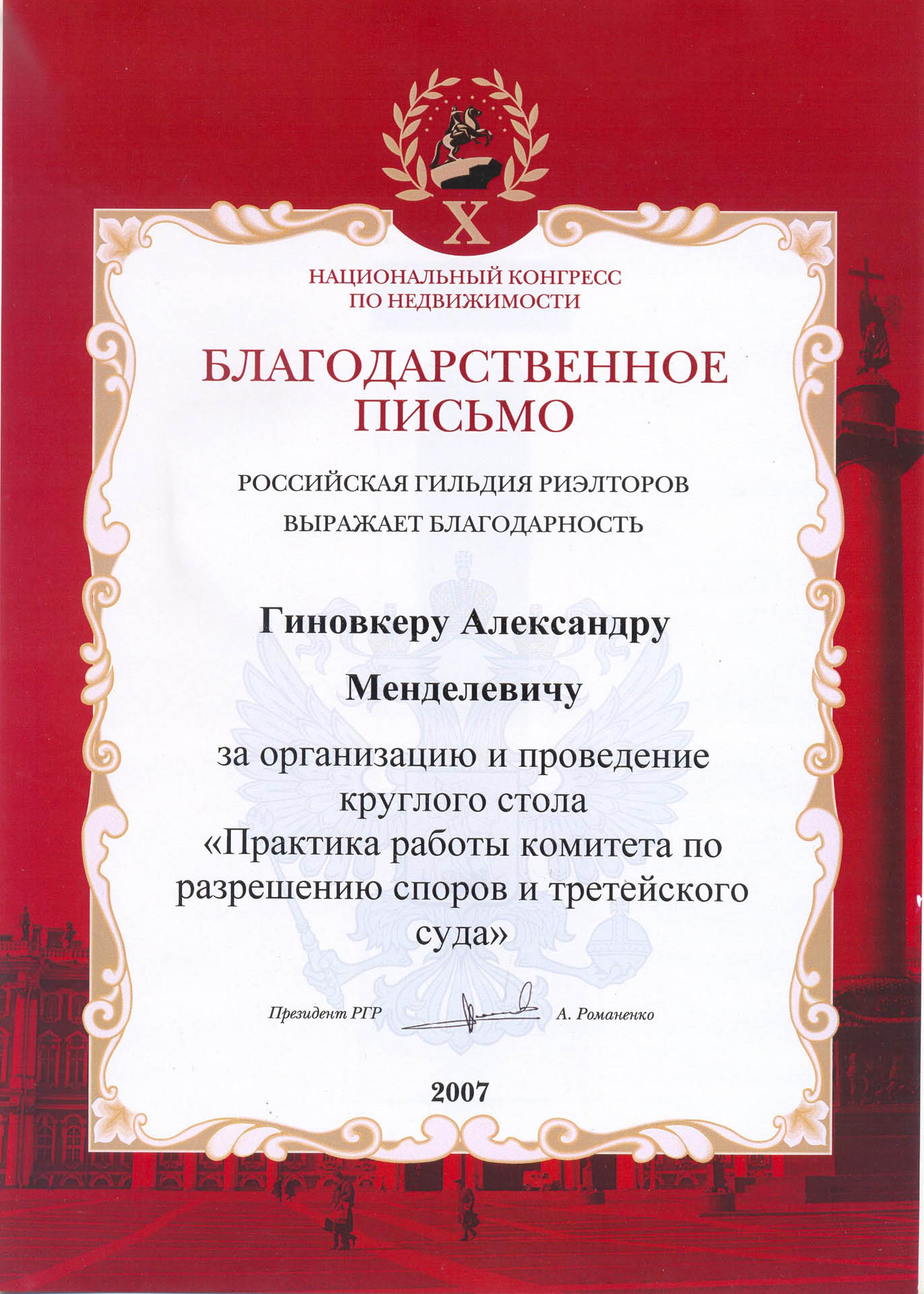 - Awarded Kudryavtsev (the founder of the Russian Gild of Realtors) plaque of honour for outstanding contribution to educational activities and image of the profession.