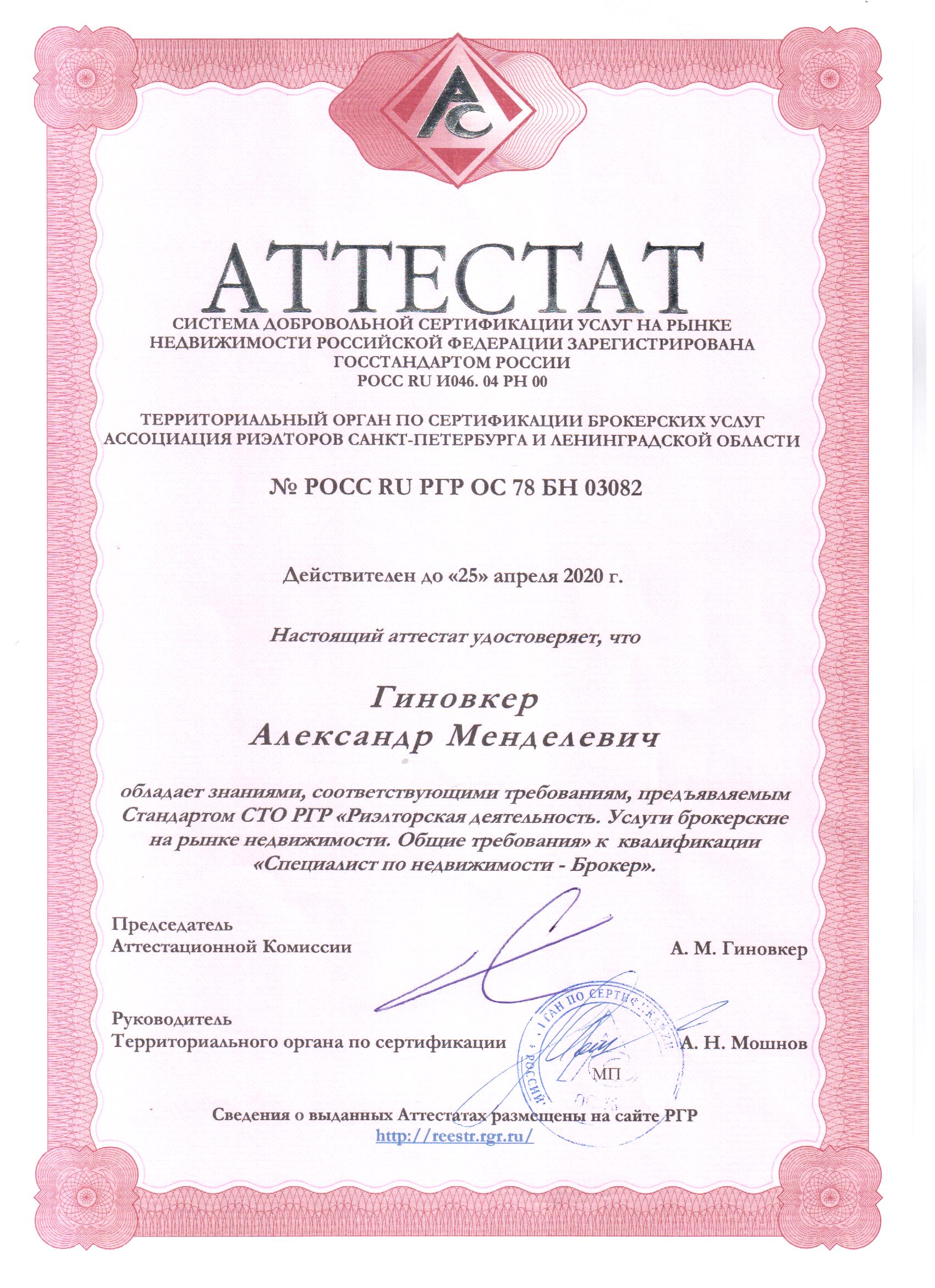 - the Chairman of the Governing Board on certification of real estate business in St Petersburg and Leningrad Region;