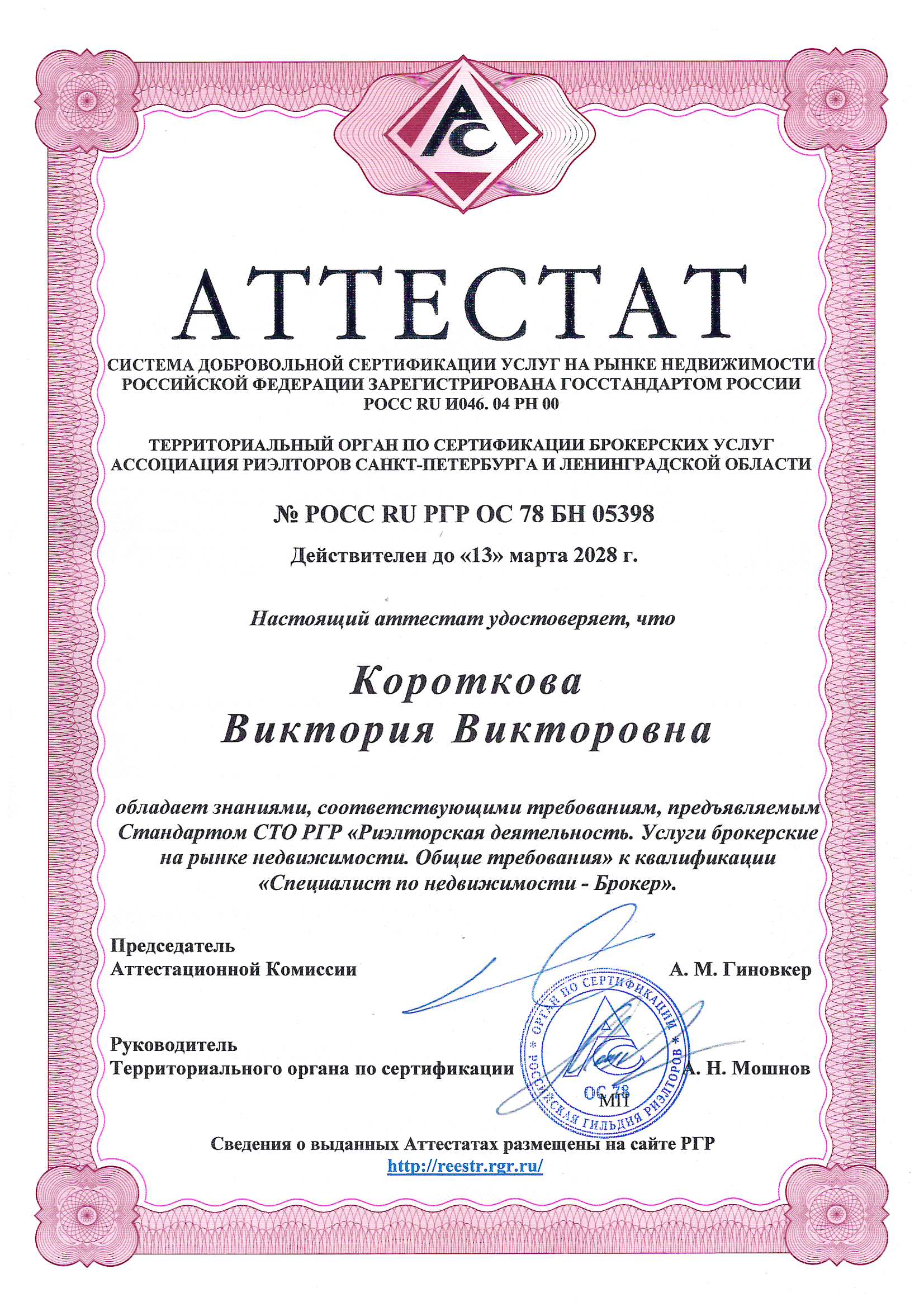 Работает в "Невском просторе" с 2022 года. Сертифицированный специалист по недвижимости. Прошла аттестацию в институте недвижимости по курсу "Специалист по недвижимости. Брокер."