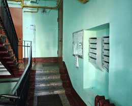 В комнате два окна, потолок 3.2 м. Квартира двусторонняя, данная комната находится на одной стороне с кухней. Одна комната муниципальная, в ней никто не проживает, она не сдана в соцнайм, признана непригодной для жилья, есть акт, используется для хранения вещей. В двух других смежных комнатах живёт семья, пять человек, соцнайм. Квартира тихая, соседи воспитанные.