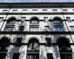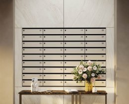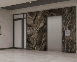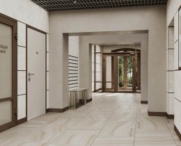 Неоклассическая архитектура жилого комплекса сочетается с современным эстетичным дизайном интерьеров входных групп и геометрией лестничных маршей.