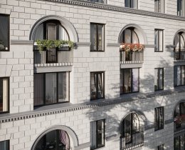Различные эргономичные планировочные решения квартир арочными окнами и французскими балконами.