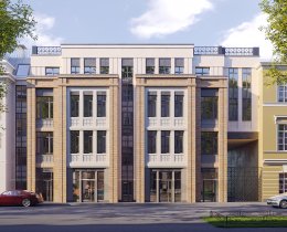 Архитектурное решение фасадов дома учитывает стилистическую направленность существующей застройки и выполнено в эстетике северного модерна. Основная плоскость фасада отделана гладкой штукатуркой в сочетании с замысловатыми вставками из фактурной декоративной штукатурки и облицовкой из натурального камня. Изысканная расстекловка окон и ажурные балконные решетки соседствуют с массивным полуциркулярным фронтоном, выигрышно подчеркивая друг друга.