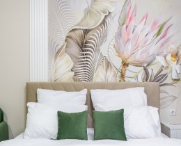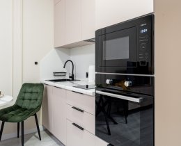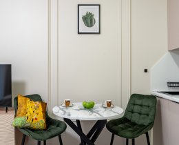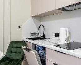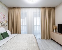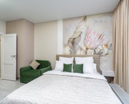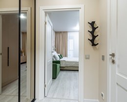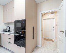 В квартире выполнен дизайнерский ремонт и есть все необходимое для комфортной жизни (посуда, постельное белье и т.п.). Кухня укомплектована бытовой техникой, спальная зона - больщой двуспальной кроватью. Много мест для хранения одежды и личных вещей. В квартире установлен планшет с видеонаблюдением и передачей данных счётчиков и отопления. КУ составляют 3 0000-4 000 в месяц в зависимости от сезона. Проведен интернет.
