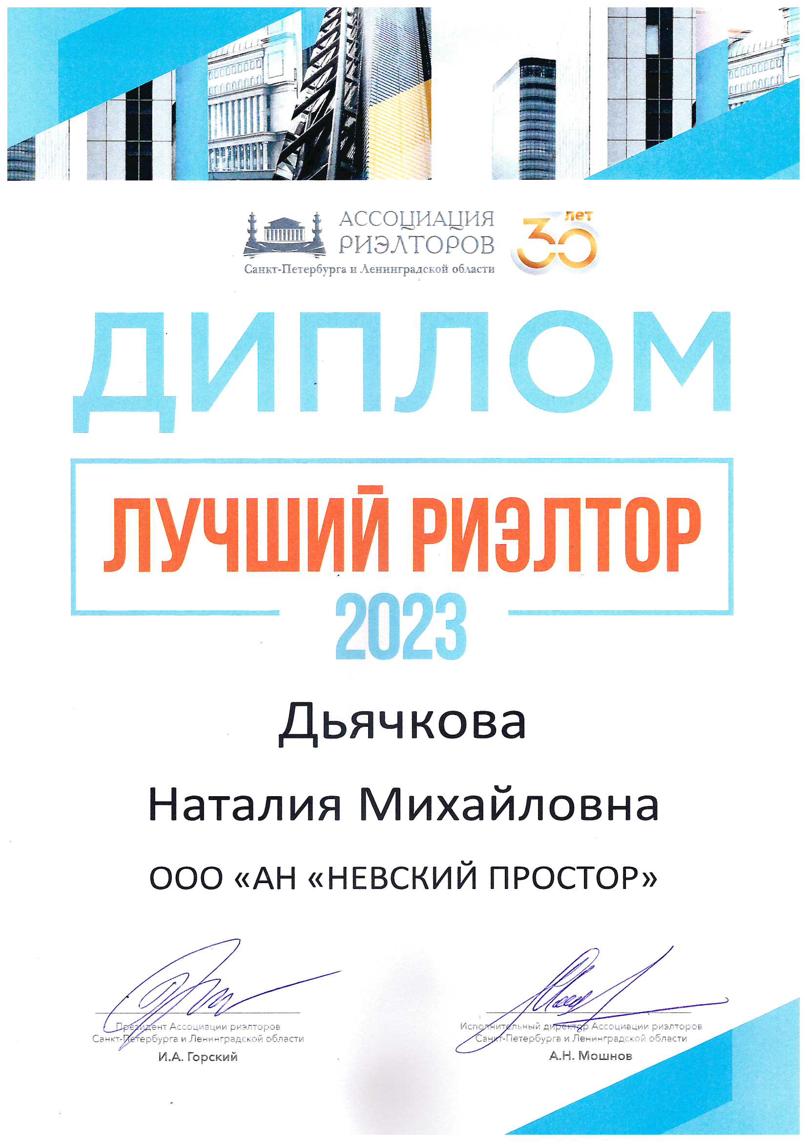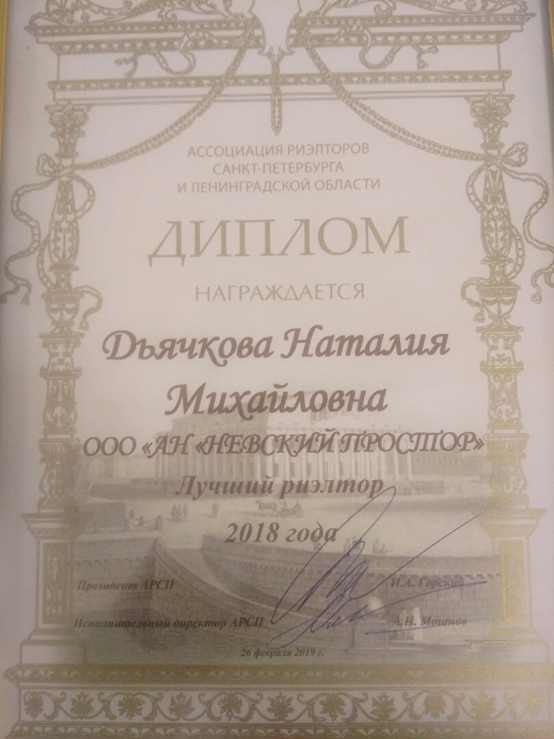 Выражаю огромную благодарность Дьячковой Наталии Михайловне, которая помогла купить квартиру в СПб, специалист высокого уровня, постоянно на связи, грамотно подходит ко всем мелочам, очень коммуникабельна, ответственна. Буду рекомендовать Вас и Ваше агенство знакомым. Также спасибо Левчук Андрею Викторовичу. Надежное агенство, замечательные специалисты.