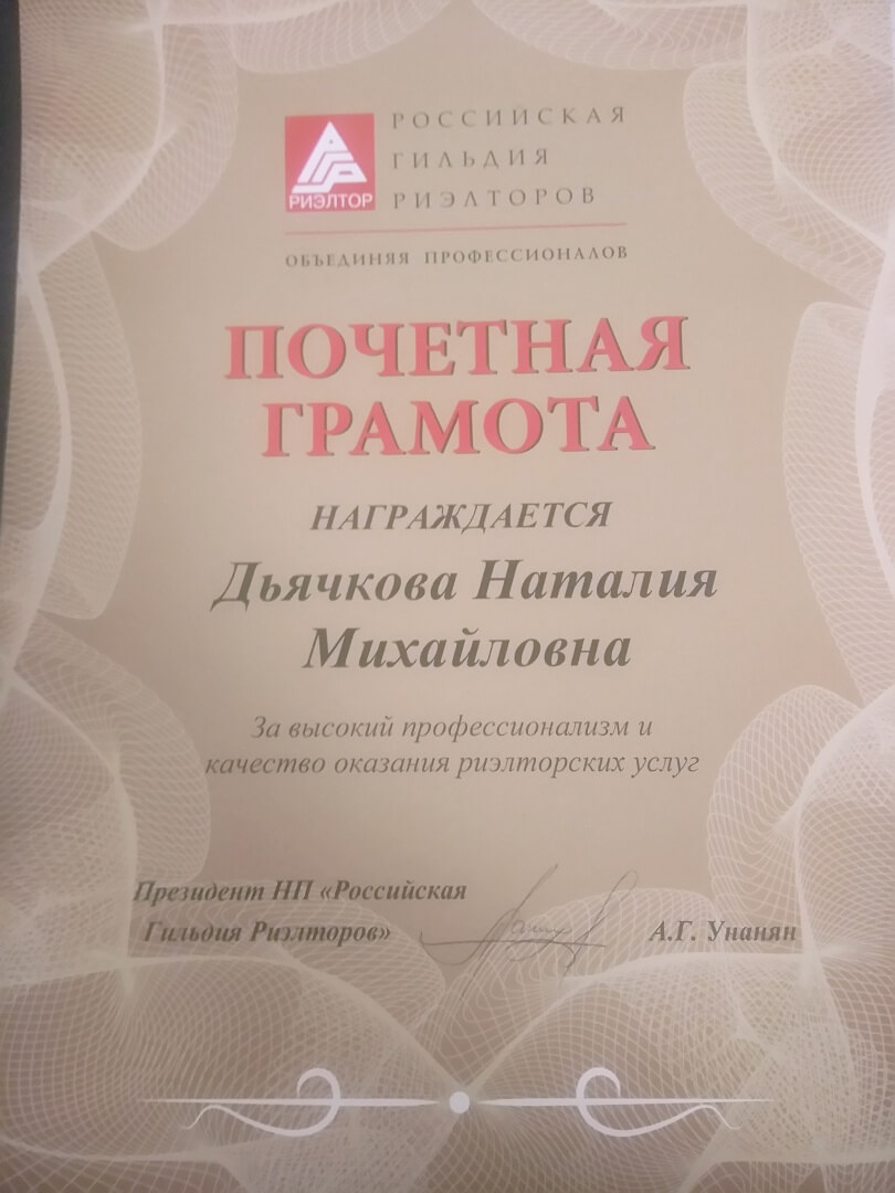 Хочу выразить благодарность риэлтору Дьячковой Наталии Михайловне. К Наталии обратились по рекомендации родственников. Огромное спасибо за профессионализм, доброжелательное отношение и максимальное понимание клиента. Работа проведена грамотно, четко и оперативно. Было много вопросов, поскольку сделка межрегиональная. Но, все прошло безупречно. Буду рекомендовать всем.
